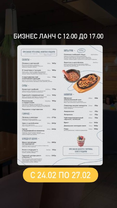 Мы рады сообщить вам о выгодном бизнес ланче, который пройдет с 12:00 до 17:00. Это отличная возможность побаловать себя вкусным и сытным обедом по доступной цене. Мы подготовили для вас разнообразное меню, которое удовлетворит самые изысканные вкусы.